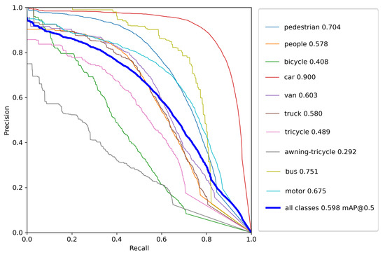 In Figure 9, the Precision-Recall (PR) curve is plotted for each class in the VisDrone 2021 dataset. The average precision for each class is indicated in the legend. From this curve, we can note that the suggested model performed the best while detecting the objects of the class ‘car’ and worst while detecting ‘awning-tricycle’. The average precision for the best classified and worst-classified classes ‘car’ and ‘awning-tricycle’ were 0.9 and 0.292, respectively. Furthermore, this conclusion is also backed by the Table 2, where the model performance on each if the individual classes has been presented. The main reason for this must be the number of instances available in the training dataset for each class, with the class ‘car’ occurring much more often than the class ‘awning-tricycle’. This can be verified from Figure 6. Additionally, while objects in the class ‘car’ are bigger and easily distinguishable, objects in ‘awning-tricycle’ tend to be quite small and could be as small as only a few pixels. Furthermore, object belonging to the class ‘awning-tricycle’ can also be confused with objects belonging to the class ‘tricycle’.