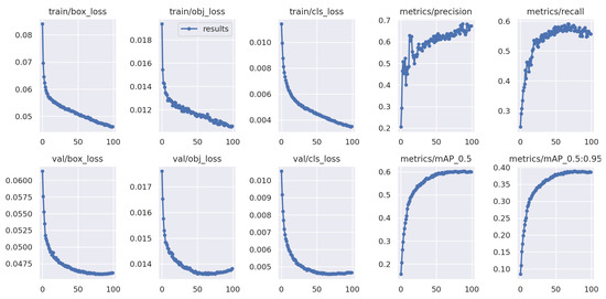 Visualization of various metrics (box loss, objective loss, class loss, precision, recall, , ) with the number of epochs during training and validation.