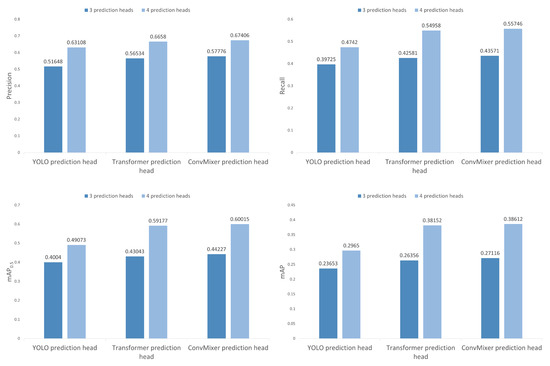 In this section, we present the results of an ablation study performed to understand the changes in the performance of object detection when there is variation in the number of prediction heads and the type of prediction heads used. For this, the number of prediction heads used was three and four, and the type of prediction heads used were the regular YOLO prediction head, transformer prediction head as used in TPHYOLO [17], and a ConvMixer [48] prediction head as used in our model. In Figure 12, the precision, recall, and and are compared side by side in bar diagrams while making the abovementioned changes. From Figure 12, we can see massive improvements in all metrics no matter which type of prediction head is used when the number of prediction heads is increased from three to four. The average improvements in precision, recall, , and using each type of prediction head are 18.88%, 25.46%, 31.91%, and 37.5%, respectively. Furthermore, we can also see that the results when replacing the YOLO prediction head with the ConvMixer prediction head is better than when replacing them with Transformer prediction heads. This is the same no matter whether the number of prediction heads is three or four. The average improvement in precision, recall, , and when replacing the YOLO prediction heads with Transformer prediction heads are 7.48%, 11.54%, 14.04%, and 20.05%, respectively. On the other hand, the average improvements in precision, recall, and when replacing the YOLO prediction heads with ConvMixer prediction heads are 9.33%, 13.61%, 16.37%, and 22.43%, respectively, which are at least 2% greater in terms of each metric as compared to when replaced by the Transformer prediction heads. These results support our claim that using ConvMixers as prediction heads of the YOLOv5 architecture helps in performance improvement for object detection in UAV imagery scenarios.