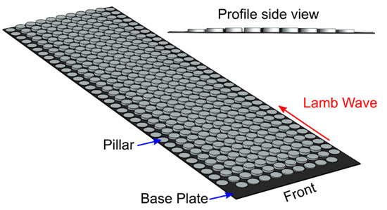 Previous researchers demonstrated that a graded-index (GRIN) lens that manipulates Lamb waves could be formed by a phononic crystal lattice of pillars or holes on the surface of a structure [14,15,16,17]. The phononic crystal unit cells change the local propagation velocity of anti-symmetric Lamb waves as a function of the pillar or hole dimensions and material [14]. The local effective refractive index of a unit cell is defined as the ratio of the Lamb wave phase velocity in the homogenous host structure and in the unit cell comprised of the phononic crystal and host structure [14,16,18]. In a phononic crystal GRIN lens, the local effective refractive index of each unit cell is gradually varied to achieve a specific effective refractive index profile. For pillar systems, this change in the effective index can also be enhanced by choosing pillar dimensions such that the longitudinal resonance of the pillar is excited at the Lamb wave frequency [19]. Similar to photonic systems, the hyperbolic secant profile of the effective refractive index is most commonly applied because it focuses the propagating Lamb waves with minimal transverse aberration and focal spot size [20].