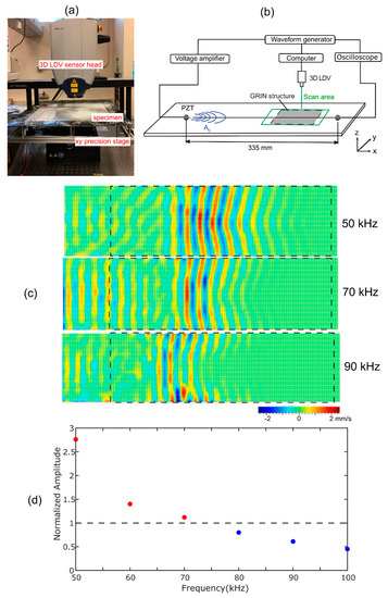 Figure 3a,b shows the experimental setup to measure the focus performance of the GRIN structure on the A0 Lamb wave propagating through the 6061 aluminum plate with 0.8 mm thickness. The dimensions of the plate are 609.6 mm × 609.6 mm. An elastomeric damping material (Dynamat®) wasused to cover the boundary of the aluminum plate on both top and bottom surfaces in order to reduce back-reflections. Two PZT actuators were bonded on each side of the aluminum plate at the same location and actuated out-of-phase in order to excite A0 mode Lamb waves. The PZT actuators were excited with a 5.5 cycle Hanning windowed burst sine wave for all experiments. The excitation signal was input to the PZTs from an arbitrary waveform generator (AWG) via a voltage amplifier.