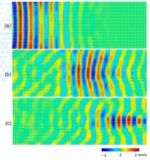 LDV measurement showing the z-directional surface velocity of 50 kHz A0 mode Lamb waves at (a) 210 µs, (b) 284 µs, and (c) 323 µs.