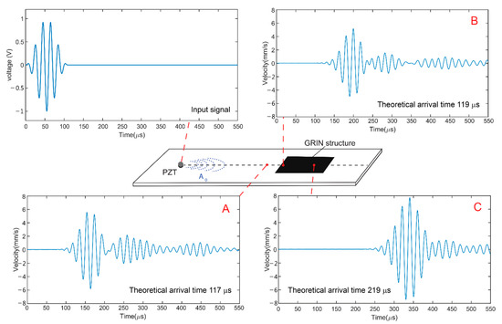 We also performed single-point LDV measurements at three different locations on the plate, as shown in Figure 5, to compare the A0 waveforms. Point A is in front of the leading edge of the GRIN structure, point B is immediately after the leading edge, and point C is at the focal point. Figure 5 plots the z-directional surface velocity at those three locations as well as the input signal to the PZT actuator. Based on the group velocity of the A0 mode from the dispersion curve, the theoretical arrival times of the A0 mode packet at points A, B, and C were 117, 119, and 219 μs, respectively. Although the PZT actuator was excited with a 5.5 cycle Hanning windowed burst sine wave, the LDV continued to measure some vibrations after the original wave packet. This could be due to the ringing of the PZT actuator because the same vibrations were collected from all three measurement locations. The peak-to-peak amplitudes of the A0 mode packets were 96, 121, and 242 mm/s for points A, B, and C, respectively. These measurements show that the A0 mode amplitude of point C was increased by 35% compared to that of point A and by 50% compared to that of point B; therefore, the A0 Lamb wave was focused by the GRIN structure.