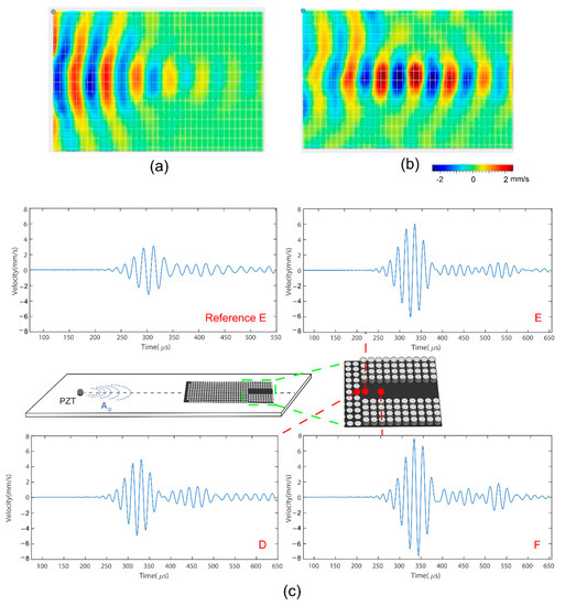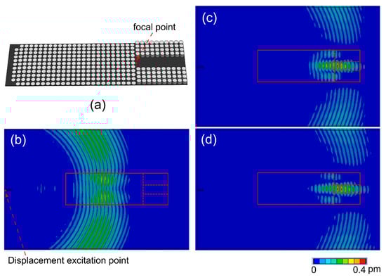 The simulated out-of-plane displacement fields are shown in Figure 6b–d at different simulation time steps. The GRIN structure with the waveguide was located on the opposite side of the plate inside the red box. The red dashed line separates the boundary of the GRIN structure and the channel waveguide. Figure 6b plots the out-of-plane displacement at 208 µs when the A0 Lamb wave is propagating through the GRIN structure before reaching the focal point and shows the bending of the wavefront toward the focal point. The wave was focused at the beginning of the waveguide, indicated by Figure 6c. Finally, the wave entered the channel of the waveguide and was confined by the channel, shown in Figure 6d.