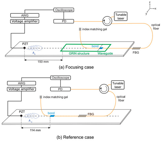 The response of an FBG sensor, bonded in the waveguide channel region, was measured, varying the location of the sensor along the waveguide channel and the length of the optical fiber bonded in the channel. Figure 8a shows the setup for these experiments. The optical fiber was bonded on the aluminum plate surface, on the opposite side from the GRIN structure, using cyanoacrylate (CA) adhesive (Loctite®). The width of the bond area was 10 mm and was centered in the waveguide channel. The FBG was located at 100 mm along the optical fiber from the adhesive bond location. In this remote bonding configuration, the A0 Lamb wave propagating through the aluminum plate was coupled with the optical fiber-guided traveling wave through the adhesive bond (blue rectangle) and coupled into a longitudinal (L01) wave in the optical fiber [11]. The L01 wave propagated along the fiber and was measured with the FBG sensor.