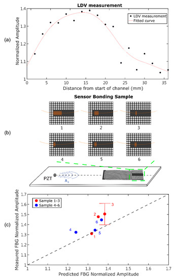 Six different FBG bond geometries were experimentally tested, as indicated in Figure 9b and listed in Table 2. The orange regions in Figure 9b are the sensor bonding area. The first three samples (1–3) varied the bond length (from 20 to 2 mm) while including the location of the highest wave amplitude. The second three samples (4–6) kept the bond length constant at 5 mm while varying the bond location along the channel. All samples except sample 3 were rebonded and tested three times. Tests for sample 3 were performed five times because sample 3 had the smallest bond area and therefore was most affected by the manual placement accuracy. The predicted FBG output was also calculated using the average wave amplitude along each bond location from the curve fit to the LDV data in Figure 9a. The measured and predicted FBG output for each bond case are plotted against each other in Figure 9c. The data were normalized to the reference case.