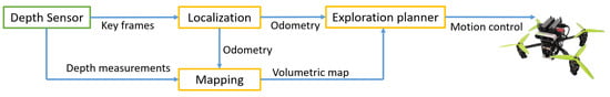 The process of robot autonomous movement and environment map building is called unknown environment exploration []. Using a Micro Aerial Vehicle (MAV) to explore in an unstructured environment is common research. Due to its high degree of motion flexibility, it is able to complete the motion track with high maneuver requirements []. A MAV equipped with computing units, vision, and positioning sensors can collect the information measurements to perceive and map the environment in real-time. MAV moves independently without prior information on the global environment but the real-time map is based on records from an airborne sensor.