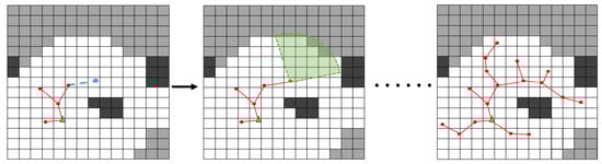 According to Algorithm 1, until the termination of the exploration, the road map is maintained by extending new nodes which are generated from random sampling. The candidate is randomly placed in . The finds a nearest node of in 3-dimensional euclidean space: