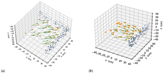 Example of best yaw in two scenarios, each gray point depicts the position of an unknown voxel; a green arrow with an orange dot shows the best scanning direction. (a) Scenario one. (b) Scenario two.