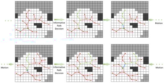 The is restored in , the is maintained and updated constantly. The is decided from the current , see Figure 4. Each node will be traveled and a candidate path that starts from the current state to the along the segments will be calculated to judge how information-rich it is. The best path with maximal utility will be the decided informative path. To realize a receding horizon control, the first segment will be executed; see the blue segment in Figure 4, the green best path corresponds to the predicted result in a period, and the blue is the motion control input.