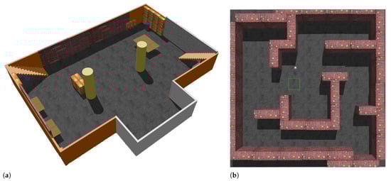 In order to verify the efficacy and efficiency of the proposed method, extensive experiments using the Gazebo simulation engine are conducted, in which the experimental environment and simulation robot share the same physical properties as that of the real world []. The software system is implemented on ROS Melodic release on top of an Ubuntu version 18.04LTS operating system, with a laptop with Intel Core i7-12700H CPU at 2.6 GHz, 32-GB memory.
