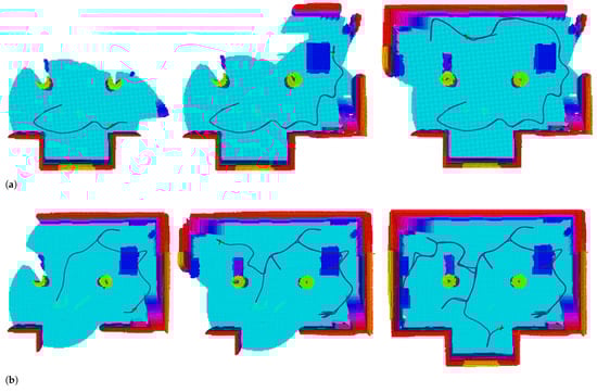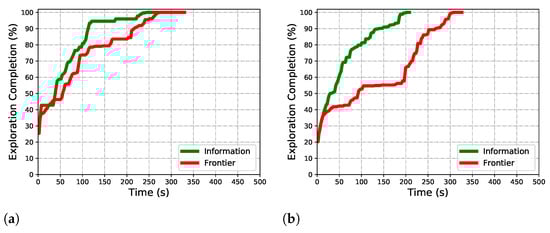 Our information-based navigation is better than the frontier-based method in overall efficiency, although it costs more time in one evaluation. Actually, the inefficient navigation to the unknown-less space is more time-expensive. Figure 12 shows the process of exploring using frontier and our information. Especially, the difference in the maze is quite obvious. Using frontier as a judgment of unknown space cannot guarantee the information content around the goal state; it navigates the robot to a local minimum sometimes due to the rarefied information content around the goal. As Figure 12a shows, from about to , the exploring rate suddenly descends compared with the rate before . Also, in the maze, as Figure 12b shows, the robot falls into a stage of low efficiency from to . The information uncertainty calculation in FOV guides the robot to a space that is unknown-rich. This guarantees efficiency in exploring, and this advantage is more prominent in the maze. A suboptimal decision is more likely to be determined in this challenging scenario, especially, when a frontier evaluation method is used.