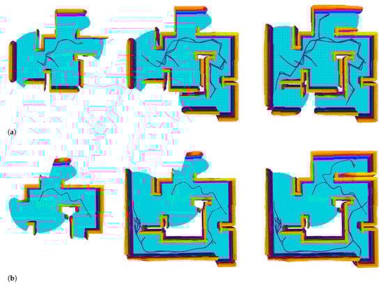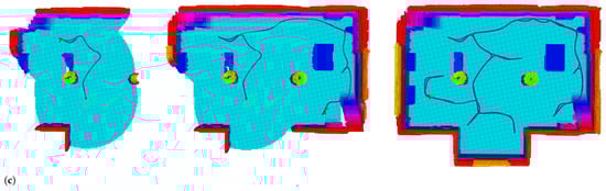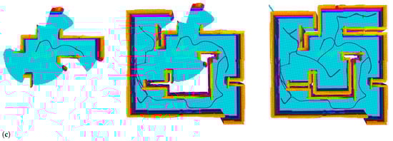 The maze is explored with the same configuration. It is more challenging due to the narrow corridors, closed dead corners, and looping space. The same experimental method is carried out and the same key data are recorded. The Normalized performs better in this scenario. As Figure 9 shows, both the Linear and Exponential fail to complete the scanning of the whole maze when the Normalized finished. The Linear performs breadth-first search behavior and frequently backtracks through the maze. The Exponential falls into the local minimum in the narrow gap in the lower left corner of the map; see Figure 9b. Repeated wandering corresponds to the exploring bottleneck that lasted for a long time; see Figure 10a, the red curve from about to . Not surprisingly, the Exponential is the fastest at the beginning until , while the Normalized maintains a persistently high rate until , and completes it about ahead of the Exponential. It can be seen clearly in Figure 11.