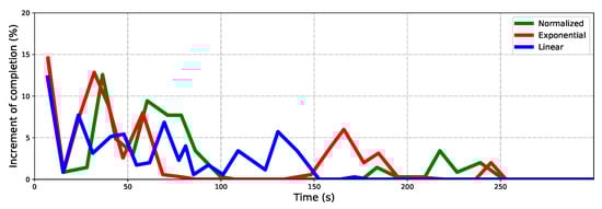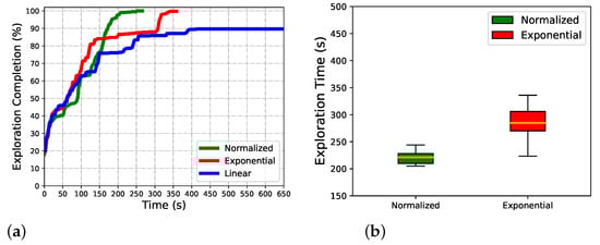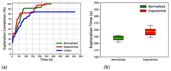 The maze is more challenging, and the algorithm that focuses on local scanning may fall into the local minimum and waste time. As Figure 10b shows, the minimum completion time difference between Normalized and Exponential is small (about ); but on the whole, its standard deviation and mean are bigger, and the performance gap is larger than in the indoor scenario.