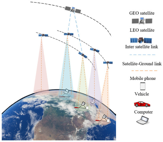 In Figure 1, a cooperative satellite–ground network made up of GEO satellites, LEO satellites, IOT devices such as UAVs, PCs, and cars, as well as mobile users such as people living in remote places, is depicted. The user terminal uploads data to the LEO satellite, which then transmits it to the GEO satellite. During satellite–ground communication, the satellite directly establishes a satellite–ground link with the user terminal.