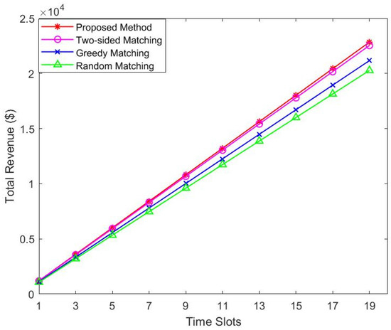 Figure 4 and Figure 5 compare the change in satellite revenue with users and the change in satellite revenue at each slot. We increase the number of users from 20 to 140 in 20 steps. As shown in Figure 4, under all four scenarios, as more users join the network, the user’s income increases. This is because the more users of the service, the more revenue. We can see that when the number of users reaches 120, the revenue is still increasing, because new users may have higher priority. On the other hand, Figure 5 shows that the revenue of satellites increases as time slots increase. The more users successfully matched, the more revenue the satellite obtains, so it shows an increasing trend. We can also observe from Figure 4 and Figure 5 that our proposed algorithm is superior to two-sided matching, greedy, and random allocation methods.
