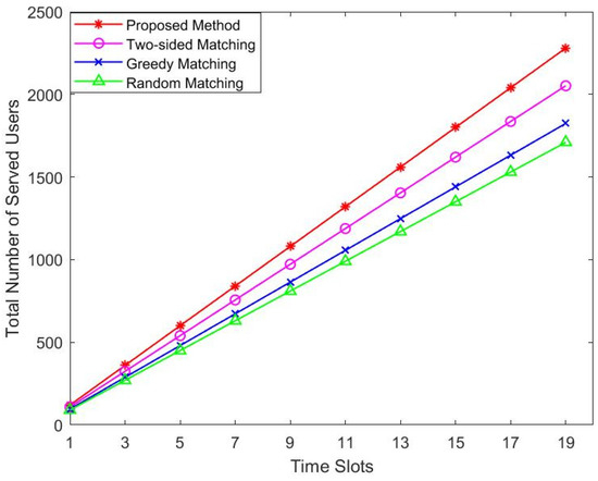 We further study the impact of time slot changes on the number of served users. For clarity, we considered the case where the user set is 120. In addition, we need to assume that the user’s requirements for delay do not change in each time slot, so that we can make a fair comparison. As shown in Figure 6, the algorithm proposed by us has an obvious growth trend, and it serves more users than the two-sided matching. The greedy algorithm and the random algorithm are far lower than the three-sided matching algorithm. The number of users served by these four algorithms increases with the increase in time slots.