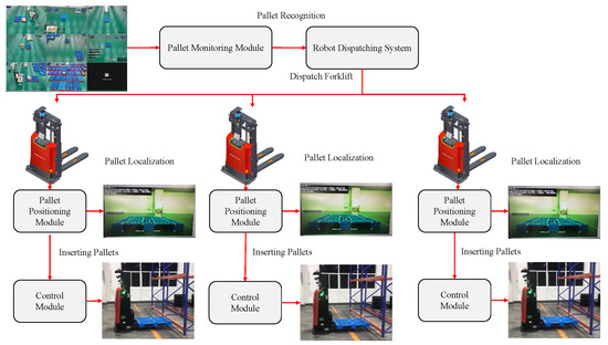The overall flow of the intelligent forklift precision cargo transfer system. RGB camera captures images of the pallet storage area and transmits them to the pallet monitoring module, which identifies the pallets and informs the dispatching system. The dispatching system dispatches forklifts to insert and pick up the identified pallets. The forklift reaches the pallet and uses the pallet positioning module to identify the pallet position, and after the position is identified, it is handed over to the high precision control module to control the vehicle to insert and pick up the pallet.