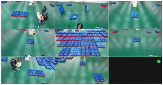 In order to test the monitoring effect of pallets from multiple cameras, we placed pallets at different locations in the 8-way camera field of view for actual testing. Considering that pallets are likely to be stacked and loaded with goods at customer sites, we placed 2 and 3 layers of pallets in a large number of pallets and placed goods at the top edge of the pallets. We used the side aperture feature of the pallets, which is not easily concealed, as the identification mark in order to prevent the influence of the goods on the pallets on the recognition results. The placement of the pallets under each camera is shown in Figure 7.