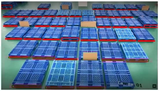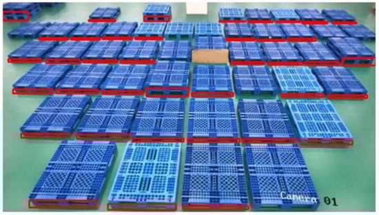 Before adding the small target detection and CBAM described in 3-A, the recognition effect of camera 8-th is shown in Figure 8. It is obvious that some pallets located further away from the camera cannot be detected, which is typically caused by unreliable recognition brought on by low pixels.
