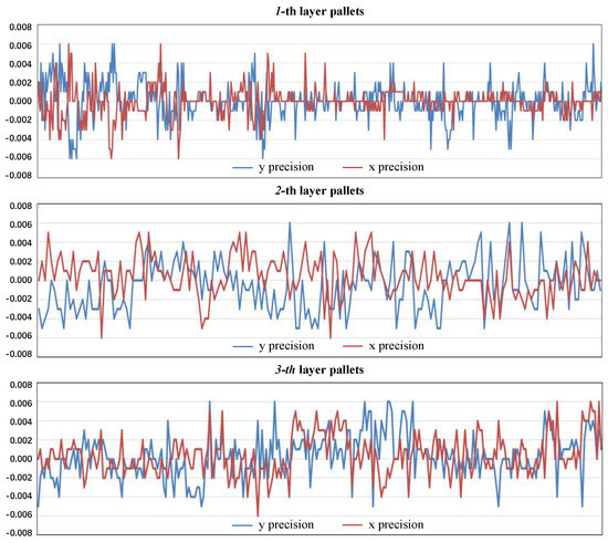 Figure 10 shows that the accuracy in both the x-direction and the y-direction can be controlled to about 5 mm. However, in some circumstances, particularly when dealing with three-layer pallets, the error will increase to 6 mm because multi-layer pallets produce more interference than single-layer pallets.