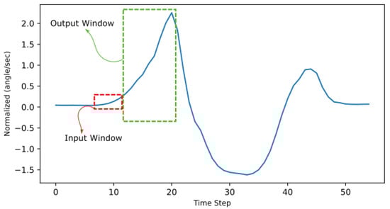 For the human gait cycle kinematic shown in Table 1, parameters are time-series data which are either linear acceleration or angular velocity sampled over fixed time intervals. Moreover, the four parallel readings or four variable features were received from the two IMUs. However, before supplying this recorded time series of IMU data to a neural network algorithm, the shape of the parallel data should be transformed into a suitable matrix for a supervised machine learning algorithm. For , where M is the number of samples, and N is the number of features transformed into a 3D dataset using a sliding window, each layer has a 2D dimension of an data sample, and the depth of the dataset depends on the number of samples to which the sliding window will be applied []. A sliding window is used to phrase the time-series data into a supervised learning format by using the previous time step’s value to forecast the subsequent time step’s value [], as illustrated in Figure 3.