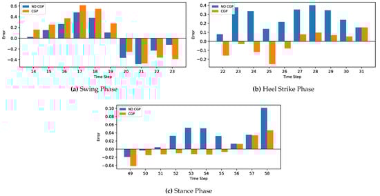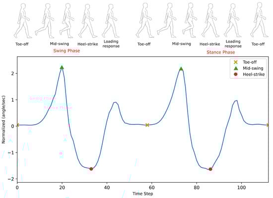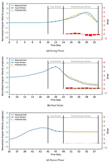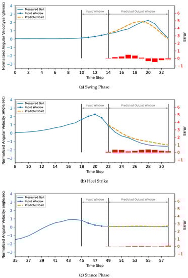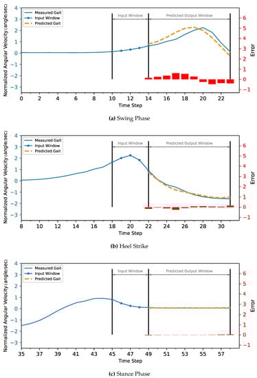 In testing, we can see the effect of presenting the model with more information on both the accuracy of trajectory prediction and computational load. The current phase state was detected and provided to the model in the second test, and statistical analysis was completed on the predicted trajectory and compared to the first test without the phase information. The gait was segmented using the threshold method using the ankle’s IMU angular velocity reading to determine the current phase: either the swing phase or the stance phase (Figure 6).