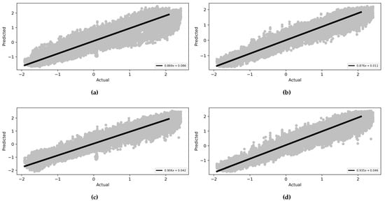 Linear correlation between the actual values (x-axis) and the predicted values (y-axis) for foot angular velocity of the 5th subject. (a) MLP—no CGP. (b) MLP—CGP. (c) CNN—no CGP. (d) CNN—CGP.