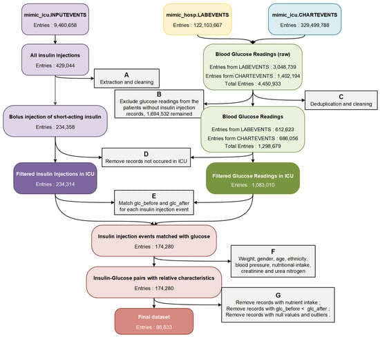 Firstly, we extracted the records of short-acting insulin injection events (containing regular insulin, Humalog, and Novolog) from the table mimic_icu.INPUTEVENTS. After removing erroneous and incomplete data, we obtained 234,358 bolus injection records of short-acting insulin from 24,750 patients and 31,920 ICU stays (step A in Figure 1). Then we extracted the blood glucose values measured by laboratory chemistry analyzers from table mimic_hosp.LABEVENTS, and the blood glucose values measured by bedside fingerstick glucometers from table mimic_icu. CHARTEVENTS (4,450,933 in total). Posteriorly, glucose data from patients who did not receive any insulin injection were excluded (step B in Figure 1). After removing duplicates, errors, and outliers, we obtained a total of 1,298,679 blood glucose test results (step C in Figure 1). We matched the occurrence time of all blood glucose readings and insulin injection events to the ICU admission records from table mimic_icu.ICUSTAYS, and all events that did not occur in the ICU were removed (step D in Figure 1).