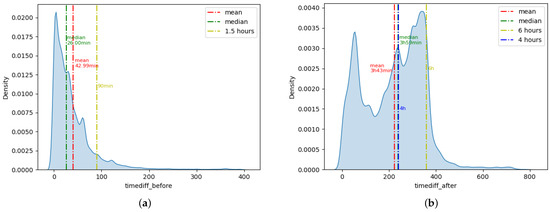 (a) Probability density diagram of timediff_before. (b) Probability density diagram of timediff_after.