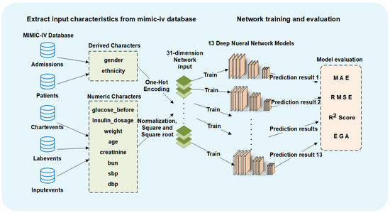 In this study, we try to explore whether the three commonly used deep learning regression models, including fully connected neural network (FCN), progressive neural network (CNN), and long short-term memory network (LSTM), could predict the effect of short-term insulin doses on blood glucose concentrations without the need for continuous past records. We extract independent discontinuous short-acting insulin-injection events occurring in the ICU from the Medical Information Mart for Intensive Care-IV (MIMIC-IV) database [53], and match each insulin injection record to the glucose values that triggered and related to the insulin treatment. Moreover, we also integrate some clinical characteristics that have been proven to be associated with insulin efficacy as predictive references, including the patient’s age, gender, weight, ethnicity, blood pressure, and renal function indexes [54,55,56,57,58,59,60]. Using these atomic records of discrete insulin injection events to train deep neural networks, and taking these demographic characteristics and basic examination results of ICU patients as the network input, we construct various deep neural networks with different architectures to predict the blood glucose concentrations of ICU patients about 4 h after short-acting insulin injections. We re-validate the predictive accuracy of the network models using the K-fold test and the Chi-square test to demonstrate the universal accuracy of our proposed networks.