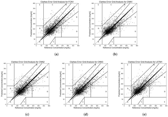 (a) Clarke Error Grid Analysis of model FCN1. (b) Clarke Error Grid Analysis of model CNN1. (c) Clarke Error Grid Analysis of model CNN2. (d) Clarke Error Grid Analysis of model CNN3. (e) Clarke Error Grid Analysis of model LSTM1.