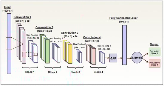 - A convolutional layer with 32 filters having a size of 5 × 1 and a stride of 2;