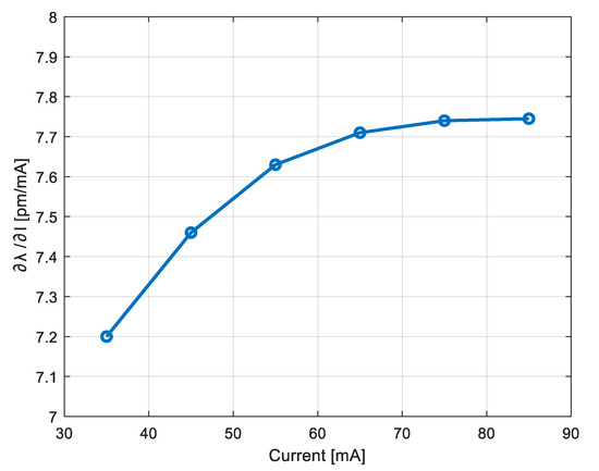 The standard modulation shape is triangular [23], and the distance value is obtained by averaging the frequencies of the ascendant and descendant phases of the triangular wave. This average improves the accuracy and cancels the contribution of a possible target motion [44]. Function (2) is linear with ftone only for small modulation amplitude and for low-frequency modulation, because the factor (∂λ/∂I) is not constant with I and should be compensated. Indeed, there are two reasons for non-linearity: the dependence of (∂λ/∂I) on I [45] and its frequency dependence [46], mainly due to the thermal behavior of the laser diode. Figure 2 shows the measurement of (∂λ/∂I) for the DFB laser at 1550 nm which will be used in the realized prototype (model WSLD-1550-020m-1-PD).