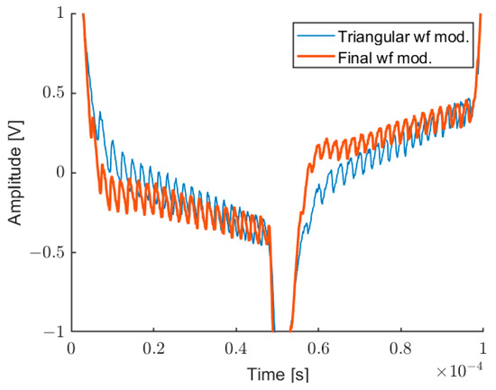 The proposed technique is a good way to decorrelate single measurements, obtaining improvement from an average procedure. The limit, however, of this approach is the very long procedure to generate the correct distortion manually, because individual waveforms influence each other: a distortion applied on the first modulating wave (at 10 kHz) changes the frequency measurement also for the following waveforms. Furthermore, once the optimal distortion has been found for one waveform (for example, at 10 kHz), it cannot be used for the others modulating waves through a simple re-sizing. For this reason, the pre-emphasis procedure must be carried out simultaneously on the entire modulating signal.