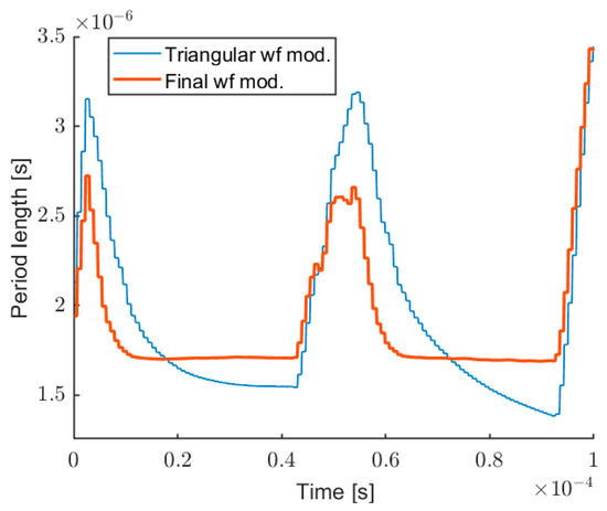 To speed up the process, we implemented a recursive algorithm on LabVIEW, able to automatically optimize the modulation shape. In a first approximation, the modulating curve should be proportional to the integral of the measured fringes period (Figure 4), given by a pure triangular modulation. Experimental evidence demonstrates that the curve thus obtained provides overcompensation, and it is impossible to find a closed formula for getting the correct pre-emphasis, because the thermal response depends also on the previous modulating waves. Our solution consists in implementing an iterative procedure for generating the modulating wave. It starts with a pure triangular modulation, and measurement of fringes period. The next modulation wave is obtained by the first one, adding a corrective wave (a pre-emphasis). The pre-emphasis is calculated as 90% of the theoretical one, given by the integral of the measured fringes period minus the target value. In the second step, the system applies the new modulating wave and measures again the resulting fringes period. A third modulating curve is then calculated by adding again the new pre-emphasis calculated as in the previous step. That operation is repeated for a few times (typically 5–10), until reaching a relative maximum error in fringes frequency lower than 10−3. The factor “90%” was evaluated empirically, finding the faster convergence to stable flat values for the fringes period. The typical duration of the whole pre-emphasis procedure is about 2 s in the automated procedure. This procedure is required only one time when the instrument is realized (once in the instrument’s life), there is no need to repeat it. During this procedure, the target should be at rest, because a target movement induces an error in the local frequency measurement.