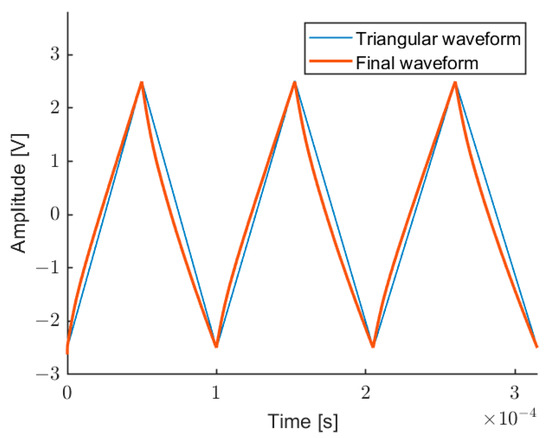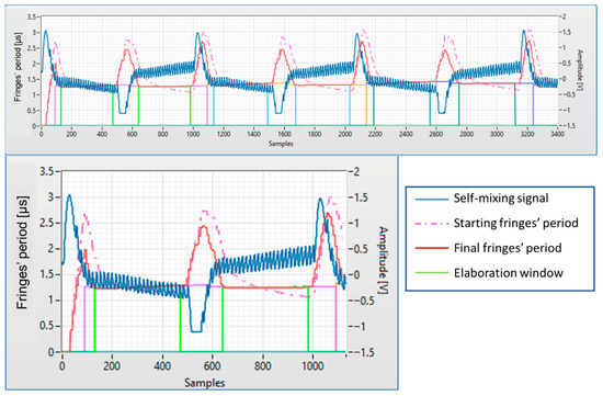 Figure 7 shows a screenshot of the LabVIEW software able to automatically calculate the distortion of three triangular waves at different frequencies (10 kHz, 9.5 kHz, and 9 kHz), in order to linearize the fringe frequency in the measurement intervals. Figure 7 shows the self-mixing signal, the measured fringe frequency, and the original fringe frequency (before compensation), and also the intervals where the interpolated FFT is evaluated (vertical lines). Figure 8 shows the corresponding modulating wave, realized by this procedure, compared with the initial triangular wave. This modulating wave drives the laser current generator.