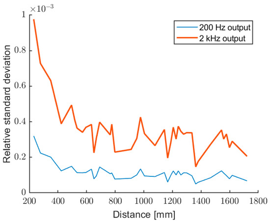 Relative standard deviation of the measured distance, for the outputs at 2 kHz (upper trace) and 200 Hz (after 10 averages).