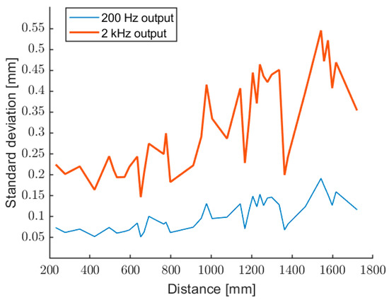Absolute standard deviation of the measured distance, for the outputs at 2 kHz (upper trace) and 200 Hz (10 averages).