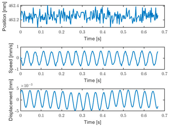Additionally, this measurement is obtained from the average of the three modulations at different frequencies. The error correction procedure of the interpolated FFT is absolutely relevant for this type of measurement, especially for low-speed movements. In vibration measurements, a minimum imbalance error between the ascent and descent phases of the modulating wave results in a constant speed offset, hence, in a drift of the measured displacement. Moreover, for small vibration amplitudes, the slightest error in the interpolated FFT, especially while the target direction changes, leads to steps in the displacement measurement. Experimentally, there has been a notable improvement in the quality of the vibration measurement obtained with this technique, following the techniques described in Section 4. For example, in [44], the same technique was used for measuring target speed, with good results. However, in that case, the target was moving at a quite high constant speed (it was a rotating cylinder at about 40 cm/s), not vibrating, and in that condition, a small error in the frequency estimation does not lead to a relevant relative error on speed measurement.