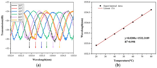 (a) The variation of the transmission spectrum with temperature increasing from 20 °C to 80 °C; (b) The linear fit of the resonant wavelength about the sensitivity of 0.018 dB/°C.