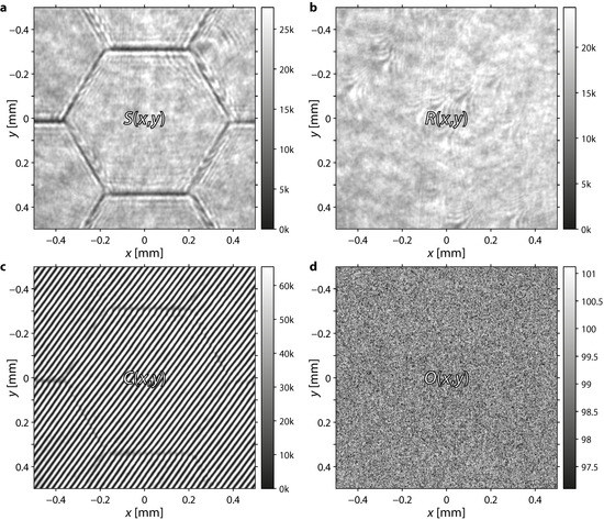 The measured interferogram was limited to a circle of a diameter 1.1× the extent of its sides to eliminate its barely lit corners (Figure 3). The tilted reference beam introduced a modulation of the interferogram with a spatial frequency . This frequency was extracted from an interferogram measured with a flat reference mirror (Thorlabs BB2-E02) by locating the beating maxima in the spatial spectrum of the interferogram. The spatial spectrum of the interferogram was recentered at this modulation frequency.