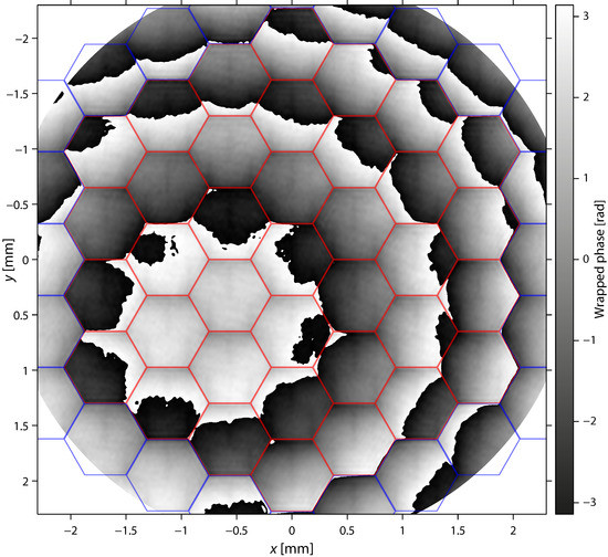 Wrapped phase map . Red hexagons indicate the active segments, and blue hexagons indicate the inactive segments of the deformable mirror.