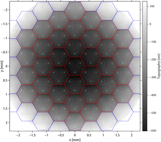 The residual tip and tilt of the deformable mirror was finally removed by least squares fitting a flat reference surface to the inactive segments in the periphery of the measured topography image.