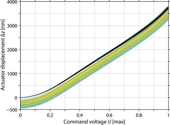 The model Equation (8) was used to interpolate the actuator responses in between the measured points. We chose the lowest polynomial order yielding fit residuals of less than about 1 nm to the data. A higher polynomial order would introduce undesired excursions in between the measured samples for matching these more closely, and it would suppress the measurement noise less effectively.