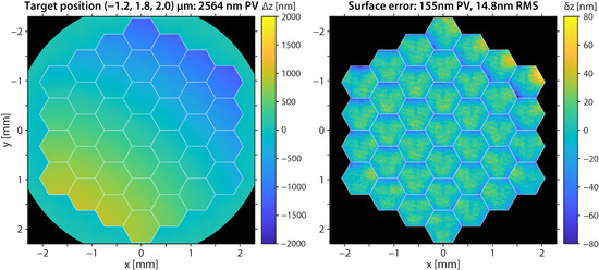 The measured displacement curves for each actuator were used as look-up tables to find the command voltage of the requested displacement by linear interpolation. We tipped and tilted the entire active surface and adjusted the commanded displacements until smooth surfaces were measured. The actuator triplets of each segment required an overdrive by 24% of their differential displacements to compensate for the mechanical crosstalk. No crosstalk was observed between the segments.
