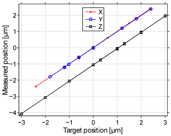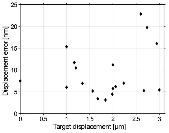 Figure 10, Figure 11 and Figure 12 illustrate the beam positioning accuracy and precision for various target positions. Laterally, a field of μm was addressed. Up to μm were addressable axially, shifted by about −1 μm by the surface curvature of the mirror that we chose not to correct. The measurement uncertainty contributed 5 to 7 nm to the measured positioning error. Regardless, the positioning errors remained mostly within ±10 nm deviation. The errors were more pronounced if some actuators approached their minimum and/or maximum displacements, where the displacement curves showed significant nonlinearity.