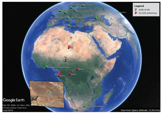 - Gaylard, M.; Bietenholz, M.; Combrinck, L.; Booth, R.; Buchner, S.; Fanaroff, B.; MacLeod, G.; Nicolson, G.; Quick, J.; Stronkhorst, P.; et al. An African VLBI Network of radio telescopes. arXiv 2014, arXiv:1405.7214. [Google Scholar]