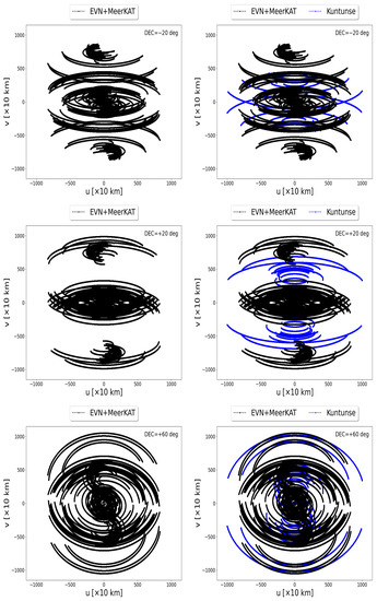 The EVN combined with the MeerKAT telescope (left panels) and the EVN combined with the MeerKAT telescope and the Kuntunse antenna in Ghana (right panels).