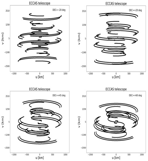 Figure 4 shows the -coverage of the six antennas in the ECCAS countries at 1.4 GHz and for four declinations. This -coverage is simulated during 10 h total time with 1 s integration time and a total bandwidth of 16 MHz divided into 64 channels. The positions of the antennas are shown in Figure 2, red points. As expected, the -coverage is very poor as the six antennas are spread over a large distance. Each of these antennas can function as a single-dish radio telescope and can perform high-level science, e.g., observing pulsars, masers, and hot gas from the Milky Way or distant galaxies.